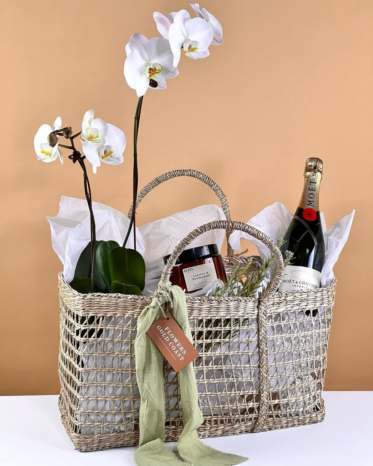 Spoil your loved ones with a gorgeous handmade basket filled with a double Phalaenopsis orchid, a delicious scented candle and French Champagne 🤍