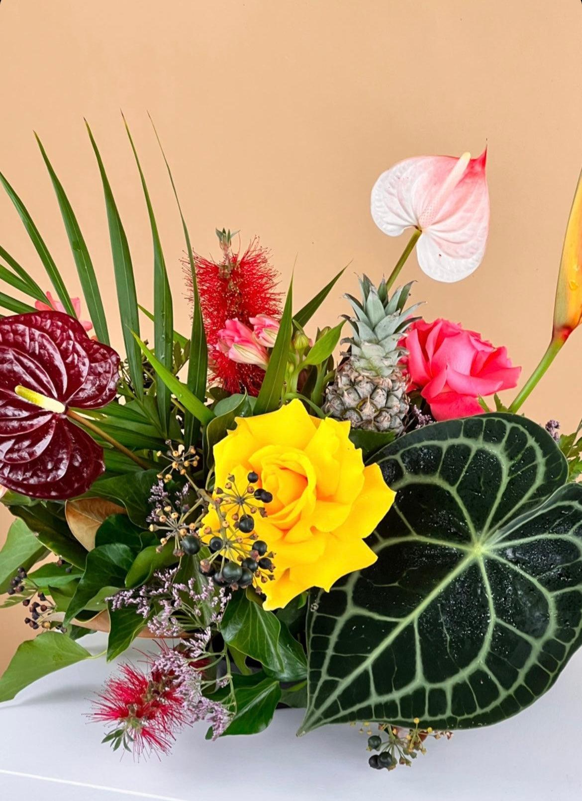 Our florist team was put to work sourcing the foliage and flowers that are often not found in your standard flower section at the markets, even finding some fantastic tropical adornments such as a Mini Pineapple, to make the arrangements extra special!